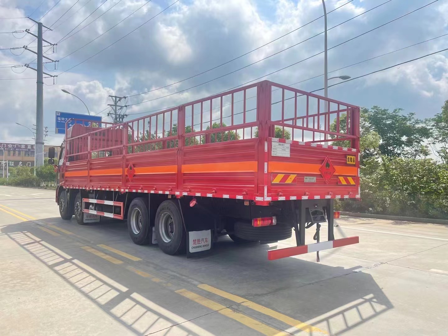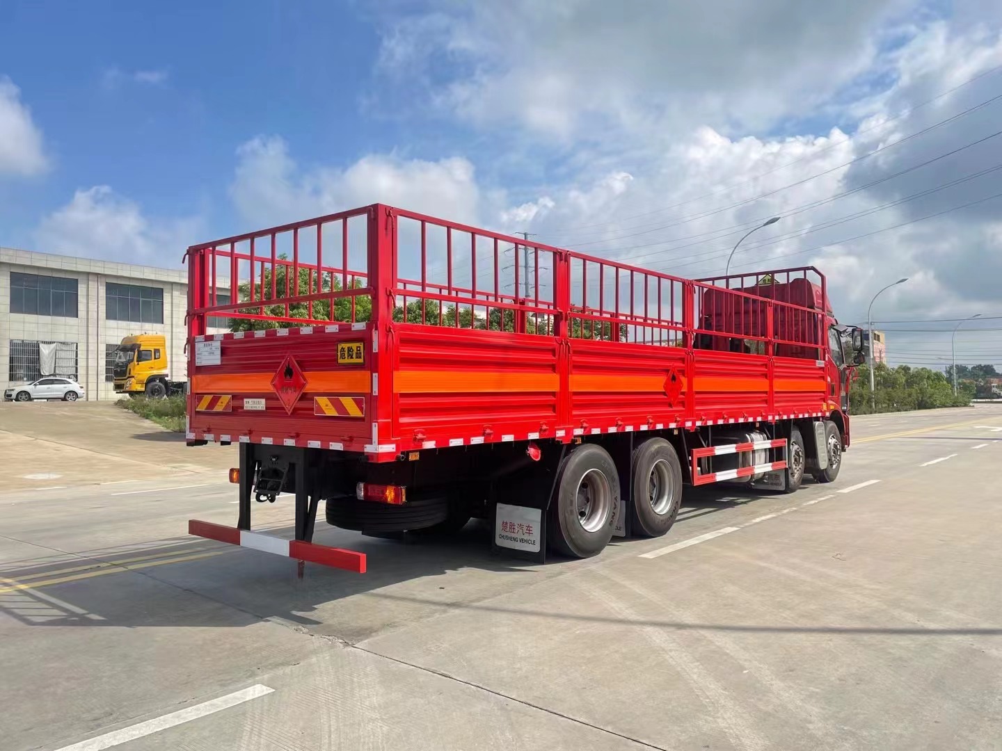 廂體邊板采用1.2mm冷板,底板標配4mm花紋鋼板,花欄及花欄立柱可拆卸,底部立柱固定,底板上方鋪靜電膠皮,底板均做防銹處理,車廂一周粘貼橙色反光帶,箱體粘貼菱形標志牌,安全告示牌,危險品牌,拖地靜電帶。
