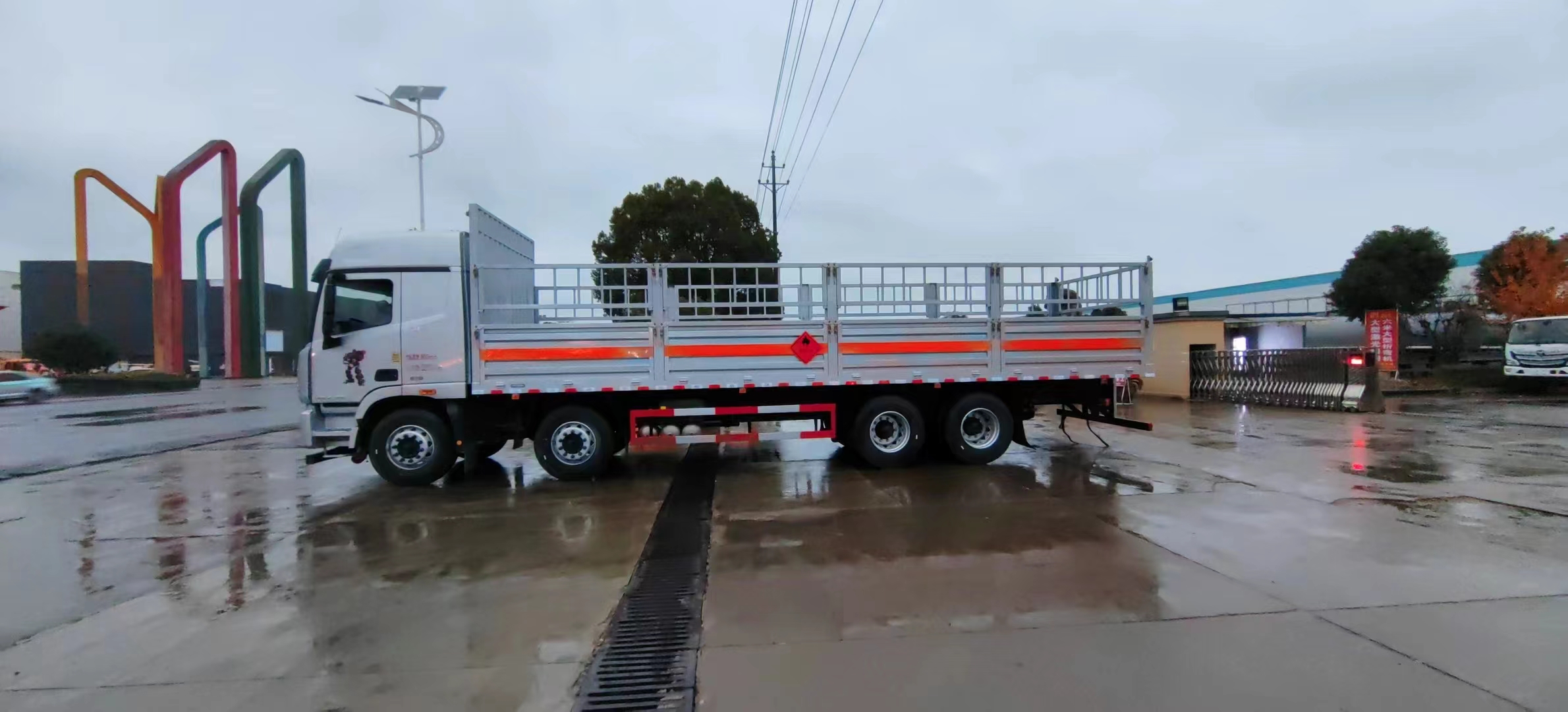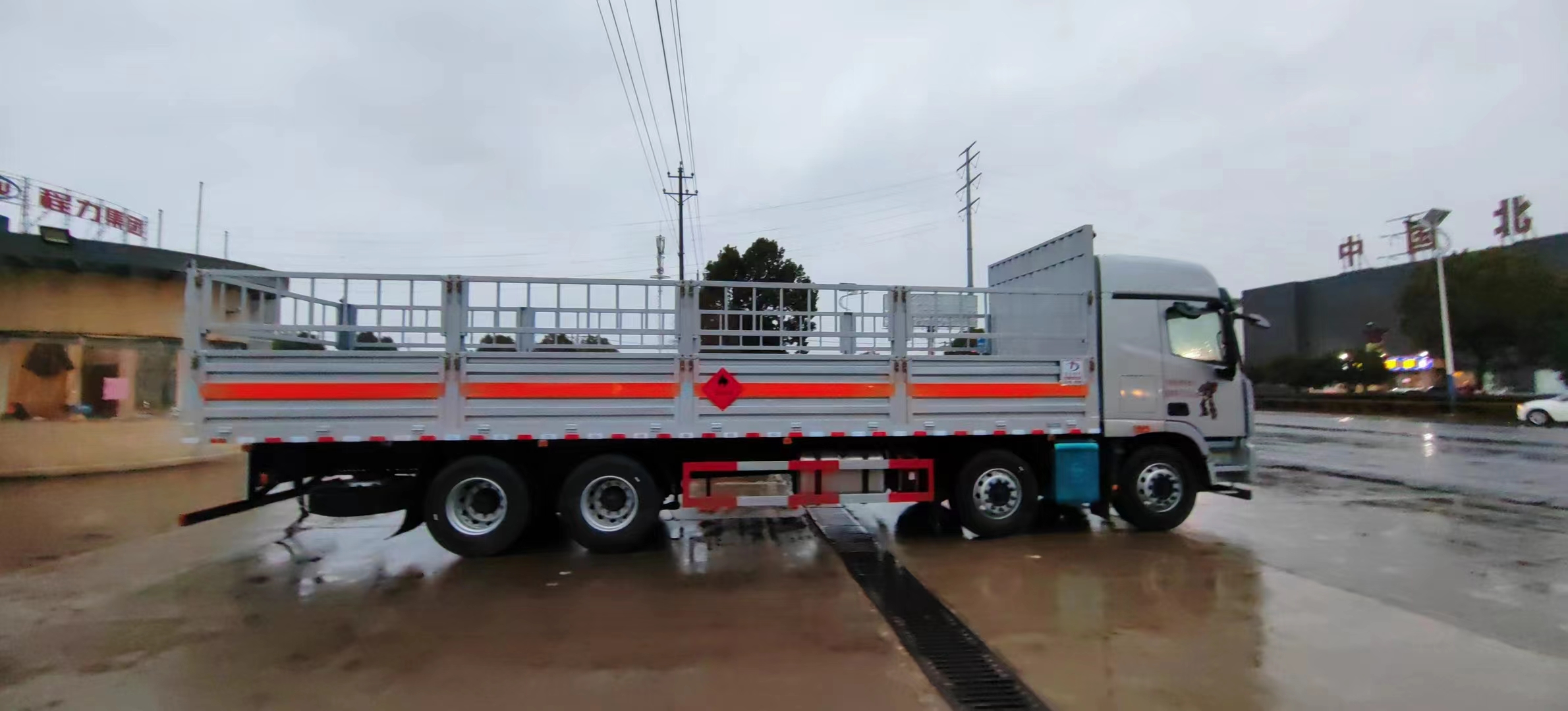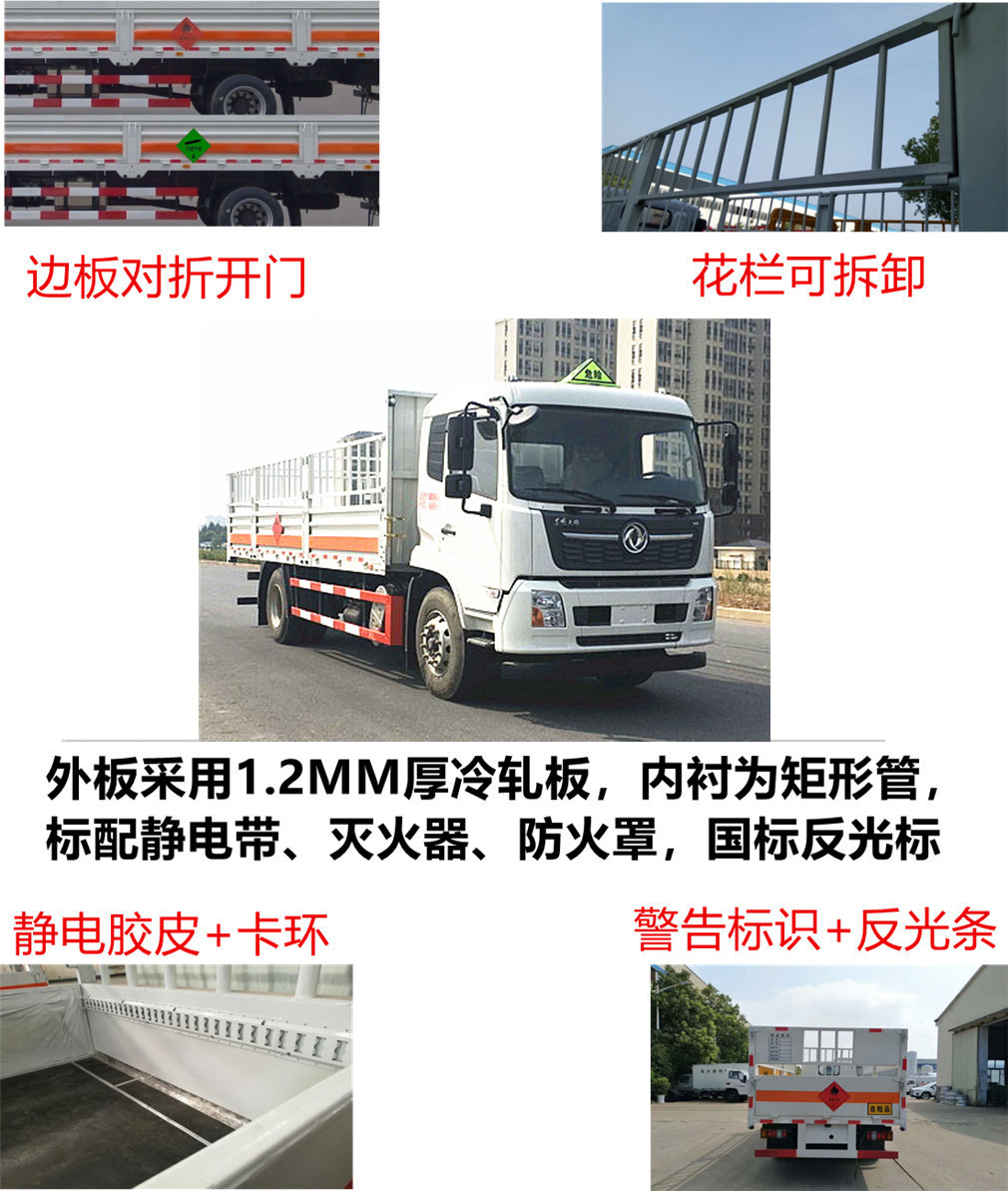 該車為危險品運輸車.箱體選裝柵欄樣式,無柵欄樣式,選裝后部樣式.該車用于運輸獨立容器(瓶)包裝的氣體氣瓶.類項號2.1,2.2.選掛2.1類易燃氣體標志牌或2.2類非易燃無毒氣體標志牌.后部安裝液壓尾板,液壓尾板收起水平長度:300mm,尾板質量為550kg.側、后防護材料為Q235,連接方式:焊接連接,后防護截面高120mm,截面寬50mm,下邊緣離地高490mm.選裝后部不帶尾板時,后防護裝置材料:Q235,連接方式為焊接,后防護截面高120mm,截面寬50mm,下邊緣離地高490mm.僅采用排氣管前置,子午胎,限速裝置,輔助制動裝置和前盤制動器的底盤;限速80km/h. |