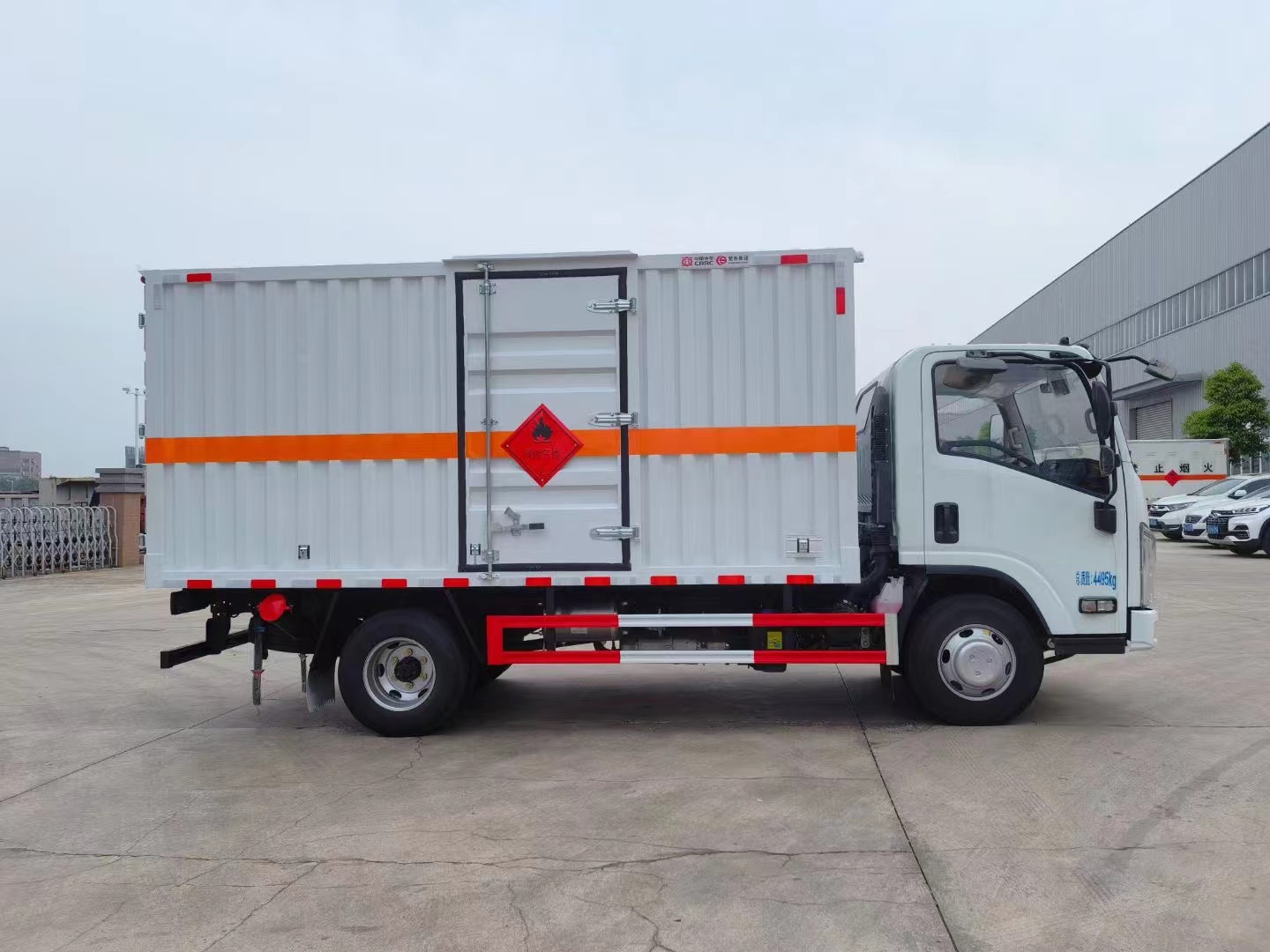 嚴格按照公告尺寸制作。外板采用烤漆板帶百葉窗,內飾為導電性能良好的鋁平板有透氣孔,矩形骨架結構內部填充防火阻燃材料,復合加鉚合工藝。廂體四周鋁合金包邊及包角,車廂底板3mm鋪設防靜電膠皮,廂體前臉50公分高鋪設防靜電膠皮。后部設置對開門,右側單開門,廂體內部兩側安裝捆綁貨物的臥環。廂體內部安裝煙霧報**器及防盜報**感應器。車廂一周粘貼橙色反光帶,箱體粘貼 菱形標志牌,安全告示牌,危險品牌,箱體安裝示廓燈(前白后紅),拖地靜電帶。