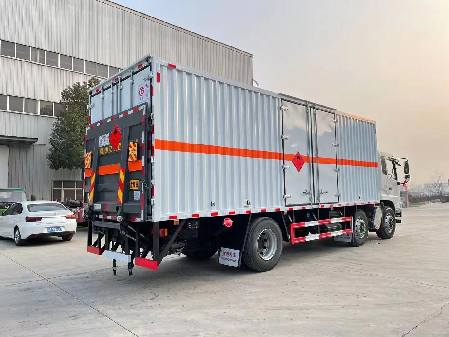 | 專用功能說明 | 1、該車為危險品運輸車.運輸具有**容器(瓶)包裝的易燃液體物品.運送危險物品類項號:3類.廂體頂部封閉不可開啟.2、側,后防護材料均為Q235,側方護螺栓連接,后防護焊接,后防護截面尺寸(mm)120×60,下邊緣離地高490mm.3、僅選用排氣管前置、限速裝置(限速80km/h)、前輪盤式制動及子午線輪胎的底盤,轉向輪安裝輪胎爆胎應急防護裝置.后軸采用空氣懸架.安裝帶有衛星定位功能的行駛記錄儀.EBS型號/廠家:EBS5/東科克諾爾商用車制動系統(十堰)有限公司.發動機/油耗值(L/100km)對應關系為:B6.2NS6B230/36.1,B6.2NS6B245/36.1.整車長度/軸距/后懸對應關系為(mm):10180/1995+4200/2555,11080/1995+5000/2655.隨底盤選裝駕室.該車型可選裝ETC車載裝置.廂體側面選裝開門型式及位置,選裝不帶側開門,選裝貨廂平面或瓦楞結構;廂體側面板選裝開百葉窗,選裝后部樣式.選裝尾板,尾板質量為550kg,尾板收起狀態水平長度為290mm。選裝制冷機組,選裝后處理隔熱罩。 | ||