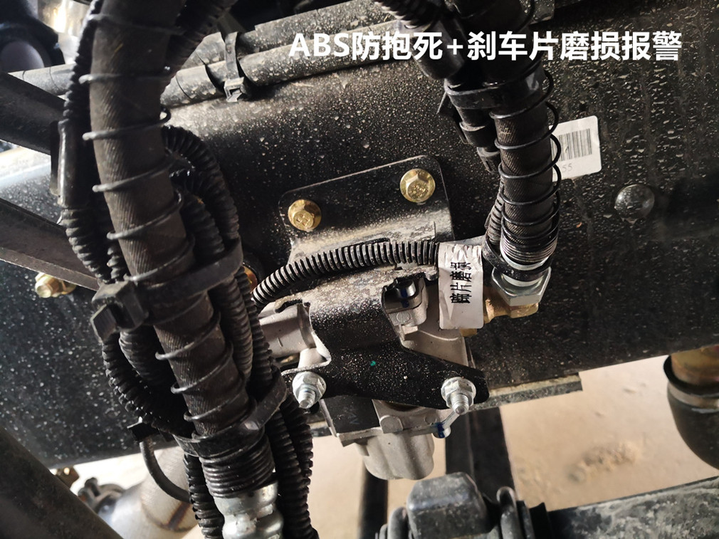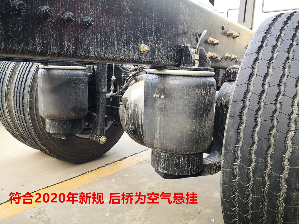 底盤配置:軸距1950+4100+1350,H57D駕駛室,YC6A290-50,9JS119TA,Ф430離合,FS160后橋/4.111,282(8)車架,600L鋁合金油箱,12R22.5,前機械后氣囊駕駛室懸置、電動液壓翻轉、夾層玻璃、電動玻璃升降器、氣囊減震司機座椅、鋁合金貯氣筒、LCD液晶儀表、MP3+收音機、空調、定速巡航系統、多態開關、電磁離合風扇、ABS、3/3/-/-后空懸、第三軸為10t提升橋、中控鎖、自動調整臂、車載終端(行駛記錄儀+兼容北斗GPS),盤式前橋,限速80km/h。