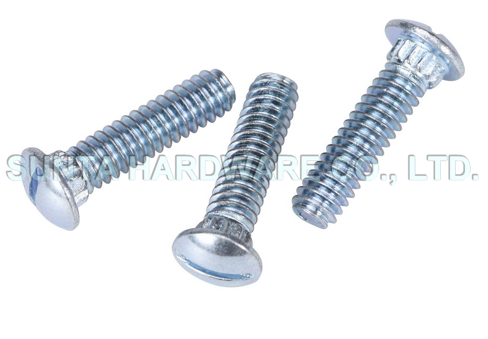 Description: ribbed track bolt, with slotted round head or philips round head. Size: 1/4-20X5/8, 1/4-20X5/8, 5/16-18X1, 3/8-16X1 etc. Surface: zinc plated.