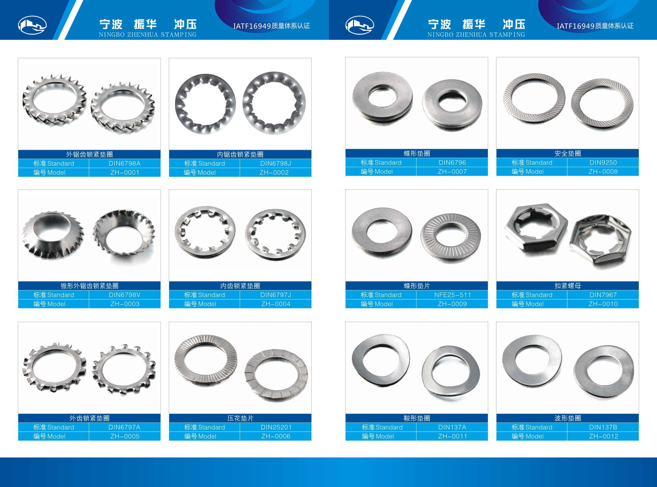 35 Years+ Experience Customize All kinds of Stamping Parts and Stand Lock Washers Material: Stainless steel(A2 304SS,A4316SS.), carbon steel, Spring steel, 65Mn,Brass,aluminum ..... Surface: Zinc plating,black,quenching,Darcomet,Nickel Plating,Plain....... Package: Export carton+ pallet Ningbo Zhenhua stamping Co., Ltd. is a proffessional enterprise which specialized in producing cold stamping production over 32years. We offer national standard products DIN seriers, nonstandard products, and OEM service . We mainly engaged in manufacturing DIN6797, DIN6798, DIN137, DIN9250,DIN6796,DIN7967, DIN432,NFE25-511, cold stamping,stainless steel stamping,car assessories stamping, and rabidity mould stamping. Besides,we also can manufacture metal stamping products to exat specifications of our clients'